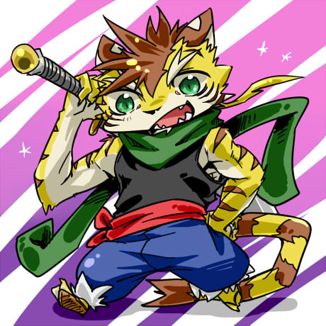 名前:タイト 身長/体重/年齡 : 176/70/19 口調 : 年上や初対面には「~っス」。それ以外にはタメロ。 虎種の青年。 自称盗賊。実際は、傭兵に近い何でも屋として生計を立てている。 一人旅ができる程度にはしっかりしているが、のんびり屋でたまに抜けているところも。 困っている人を放っておけず、お金にならなくてもつい手助けしてしまいがちである。 ぼーっとしてるときは、大体空を眺めている。特に意味はない。ごく稀に煙草を吸う。 青竜刀のような曲刀を扱う。 柄の先に装着した魔石により、刀身から雷撃を放つ。出力や方向は調節できるが、放ったあとは操作できない。 元来の性格は脳筋に近いが、師の教えにより、戦闘時は常に周囲の状況を把握するよう努めている。 *** 「タイトお前、技名とか付けねえの?」 「技名……っスか?」 「おう。技名を叫ぶと、こう、ぐわーって力が滾るってもんだろ!」 「そう、っスかねえ……?でも、そしたら相手にこっちの動きがバレちゃうし、 そもそも奇襲をかけるときなんかは逆効果なんじゃ……」 「だーっ!!いんだよ別に!そんときゃ相手の読みを上回れば! ぜーったい!あった方がいい!技名!かっこいいから!!」 「全然釈然としないんスけど」 *** よろしくお願いします。 PL:@silverio01(成人向け有)